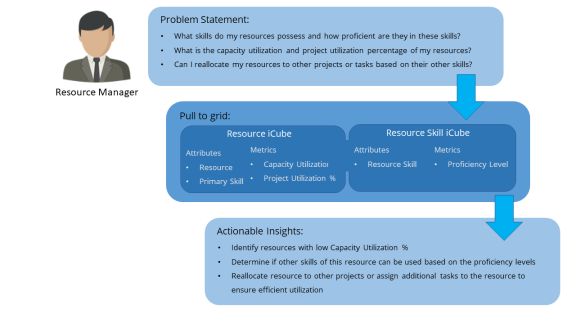 Let us look at a simple scenario to understand how you can use the Resource Management iCubes to analyze capacity utilization of resources and improve their utilization considering their other skills.