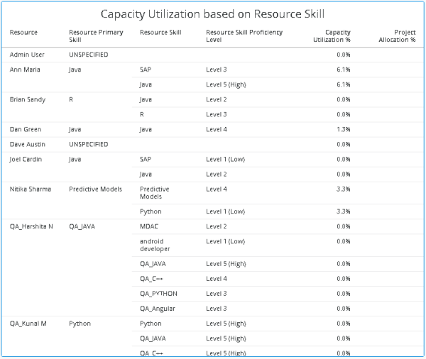 For example, from the report, the primary skill of 'Dan Green' is Java with a Proficiency Level of 4, however, the capacity utilization of this resource is at 1.3%, which indicates that the resource is under utilized.